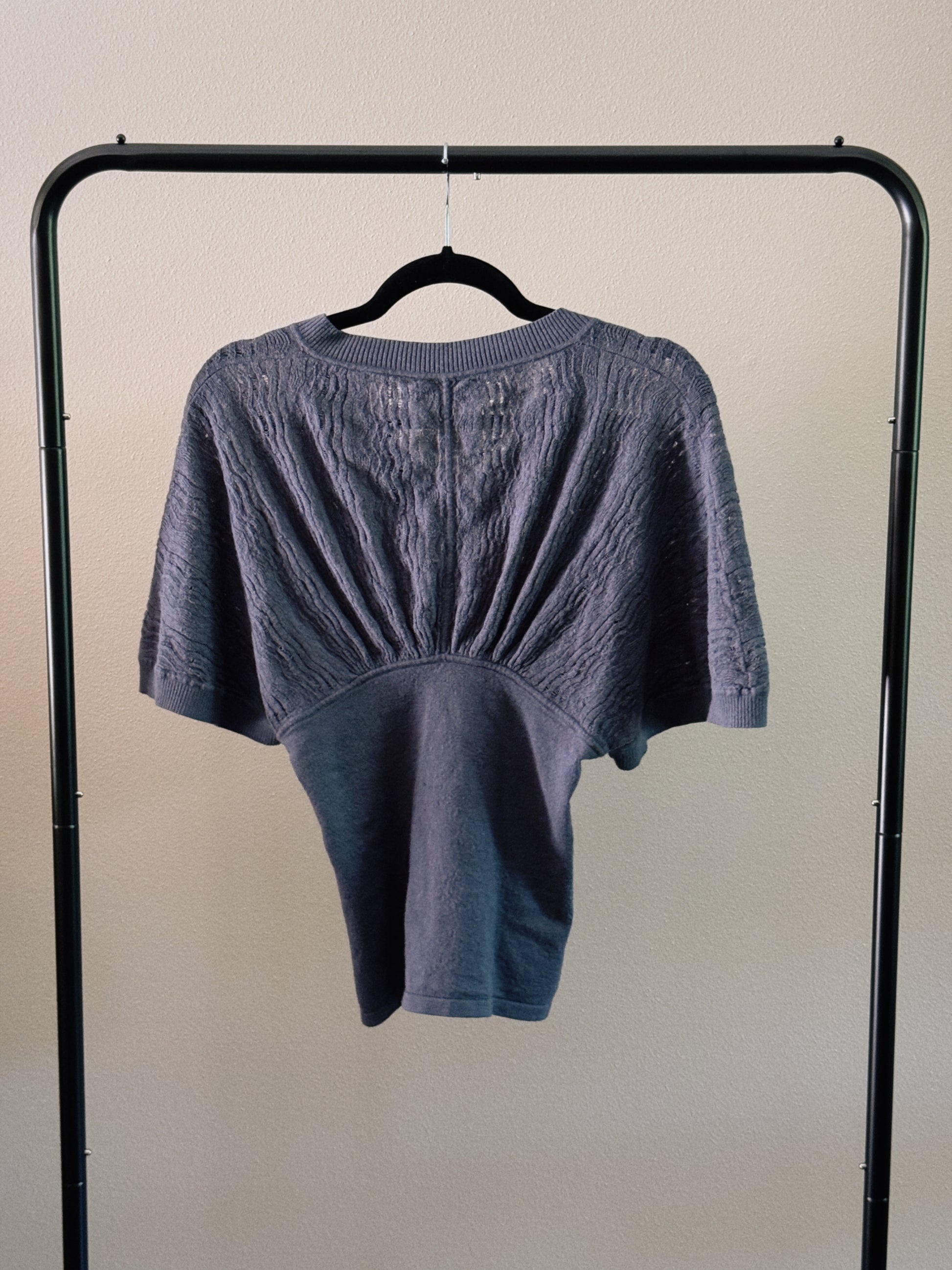 Blue knit top.