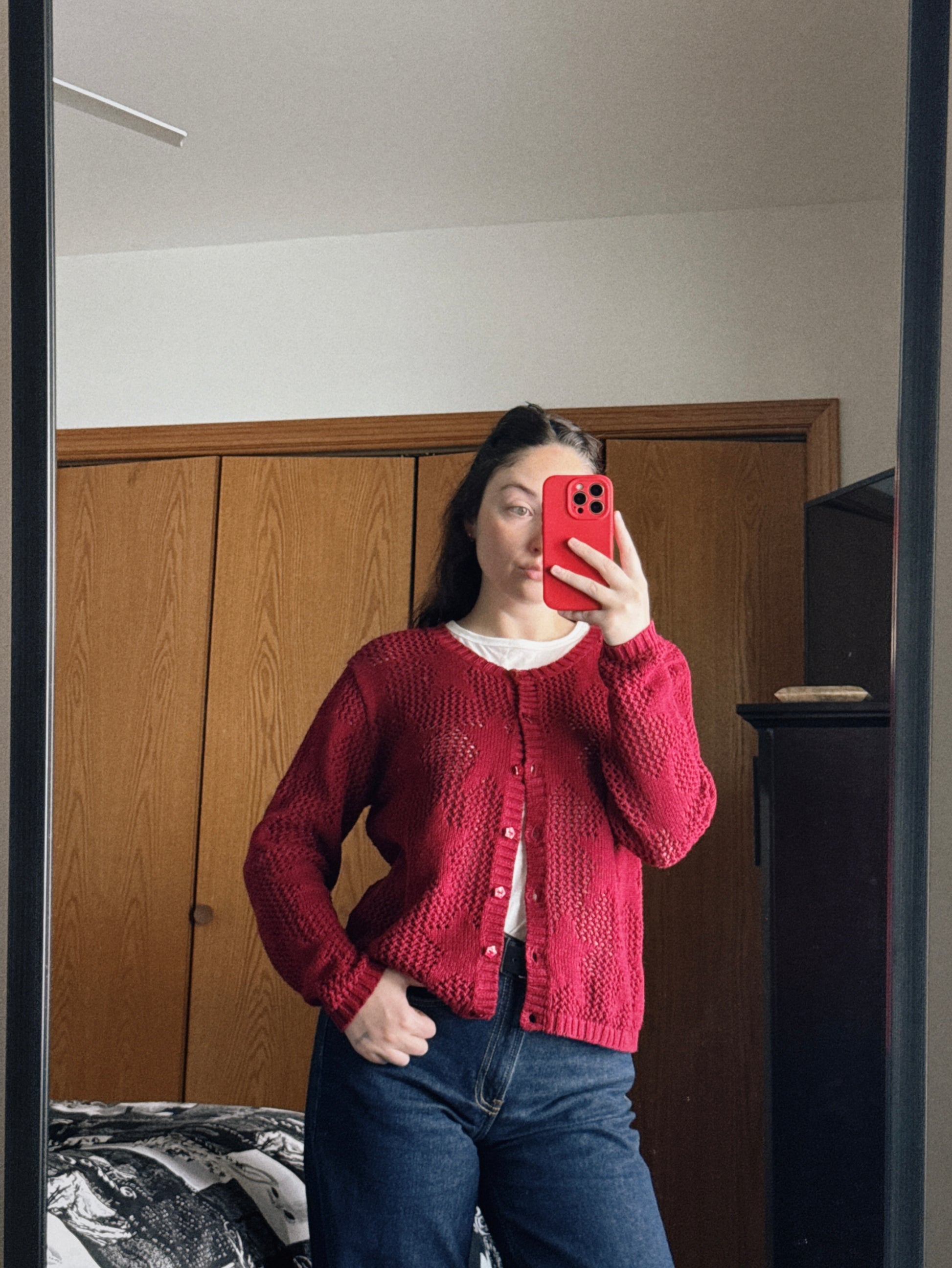 Burgundy knit cardigan featuring star pattern and button front. Has shoulder pads.