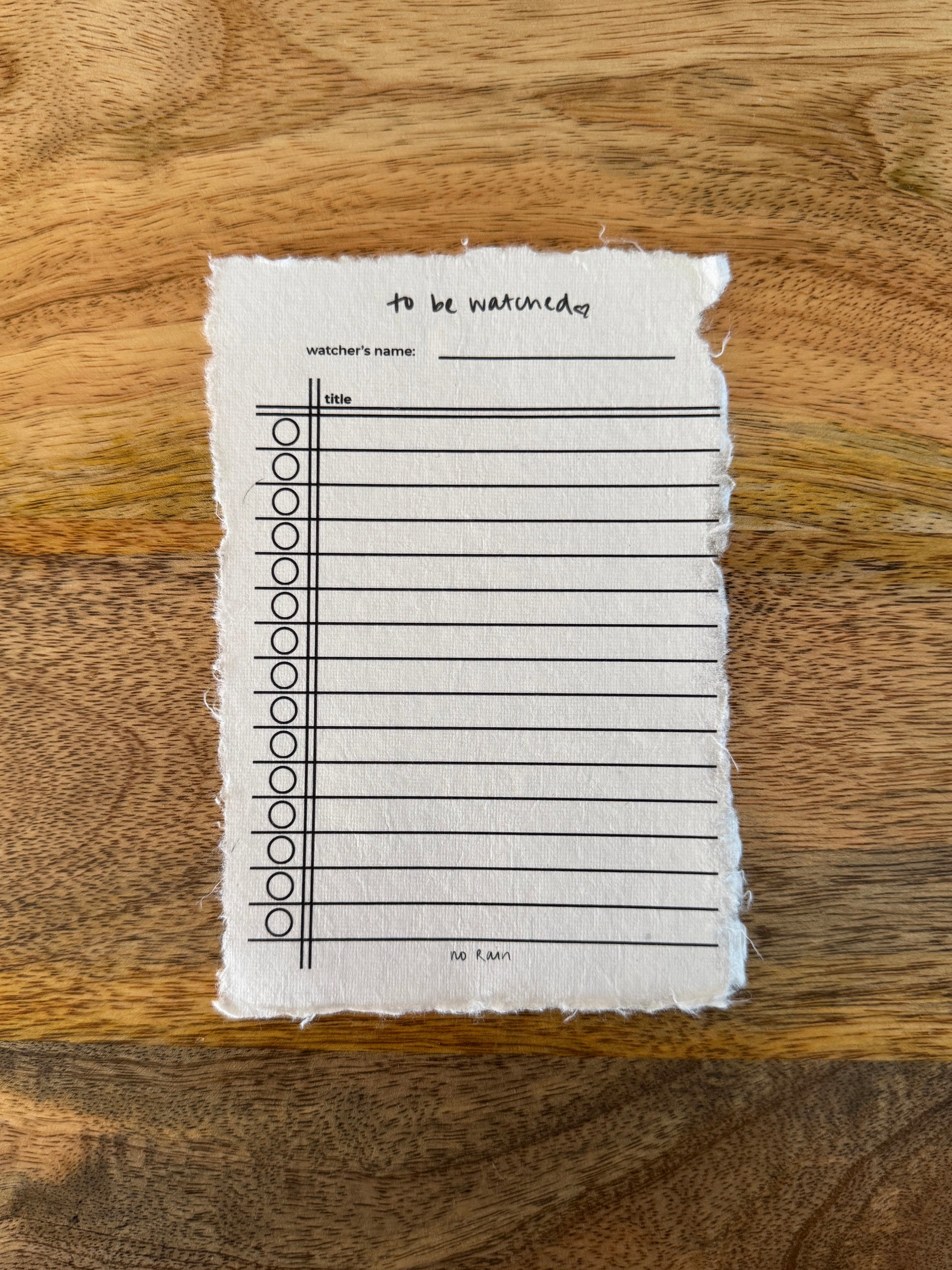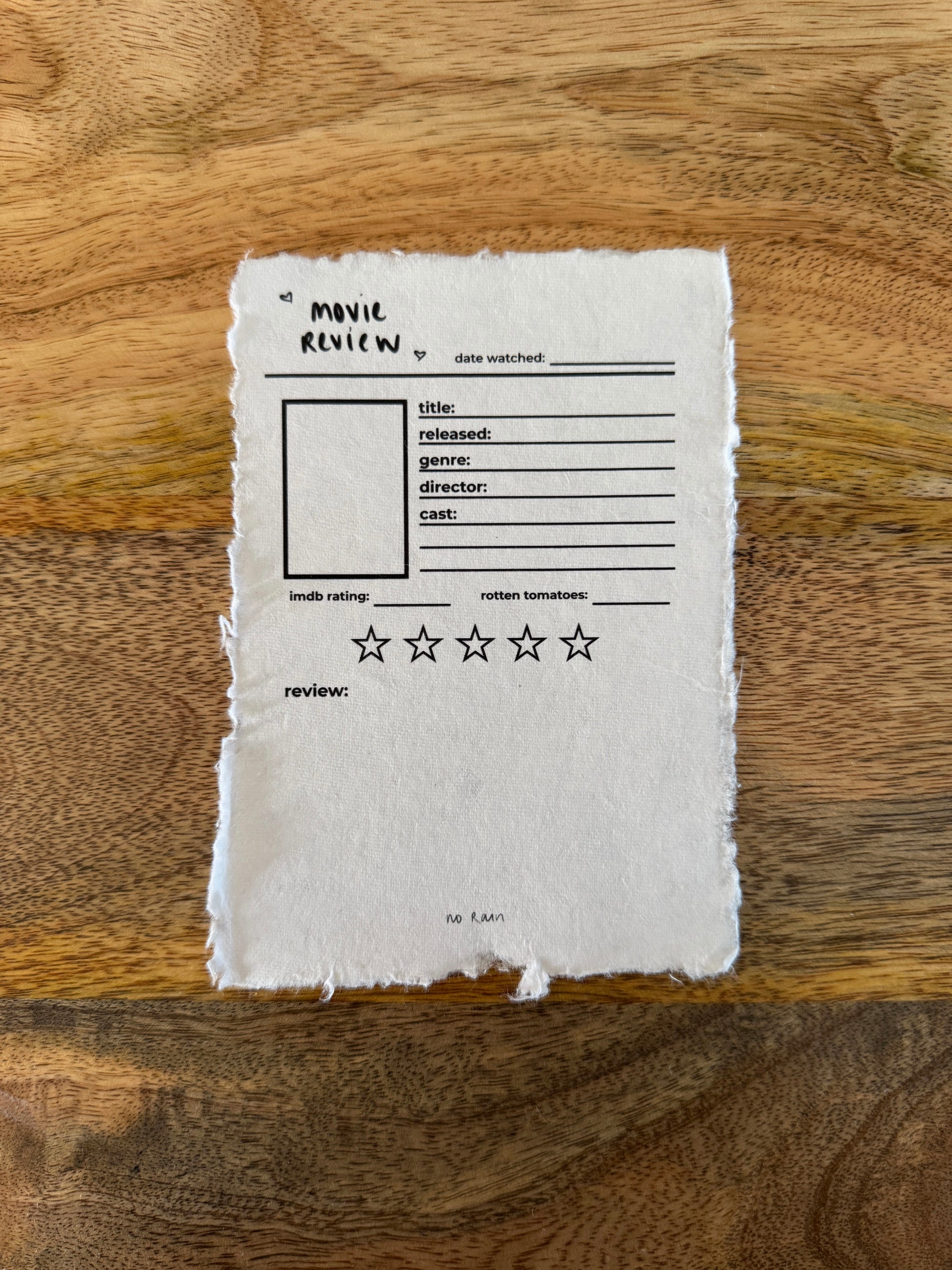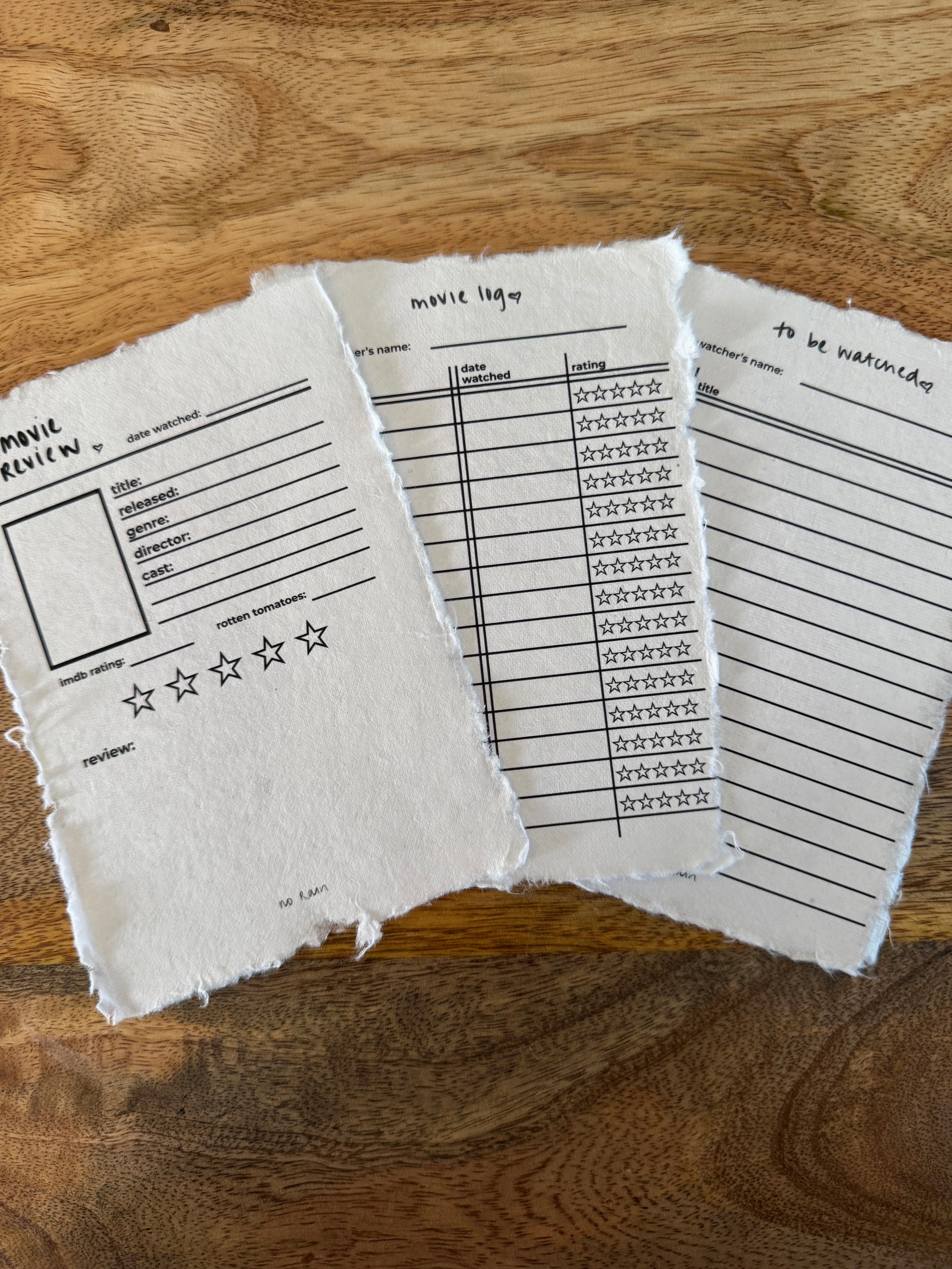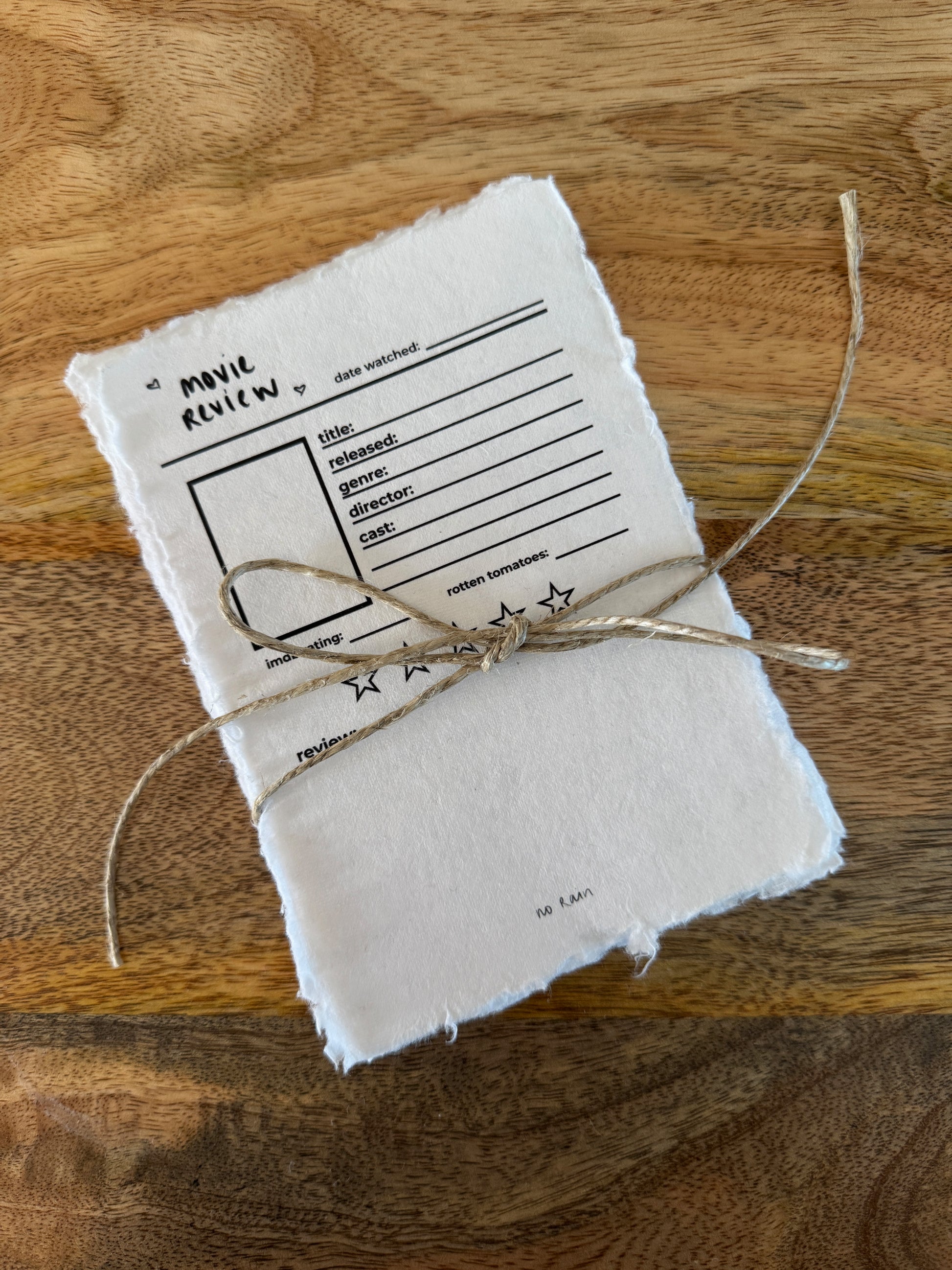 Mixed pack of movie cards on handmade, deckle-edge paper. Pack includes: 10 movie review cards, one to be watched card, and one movie log card.