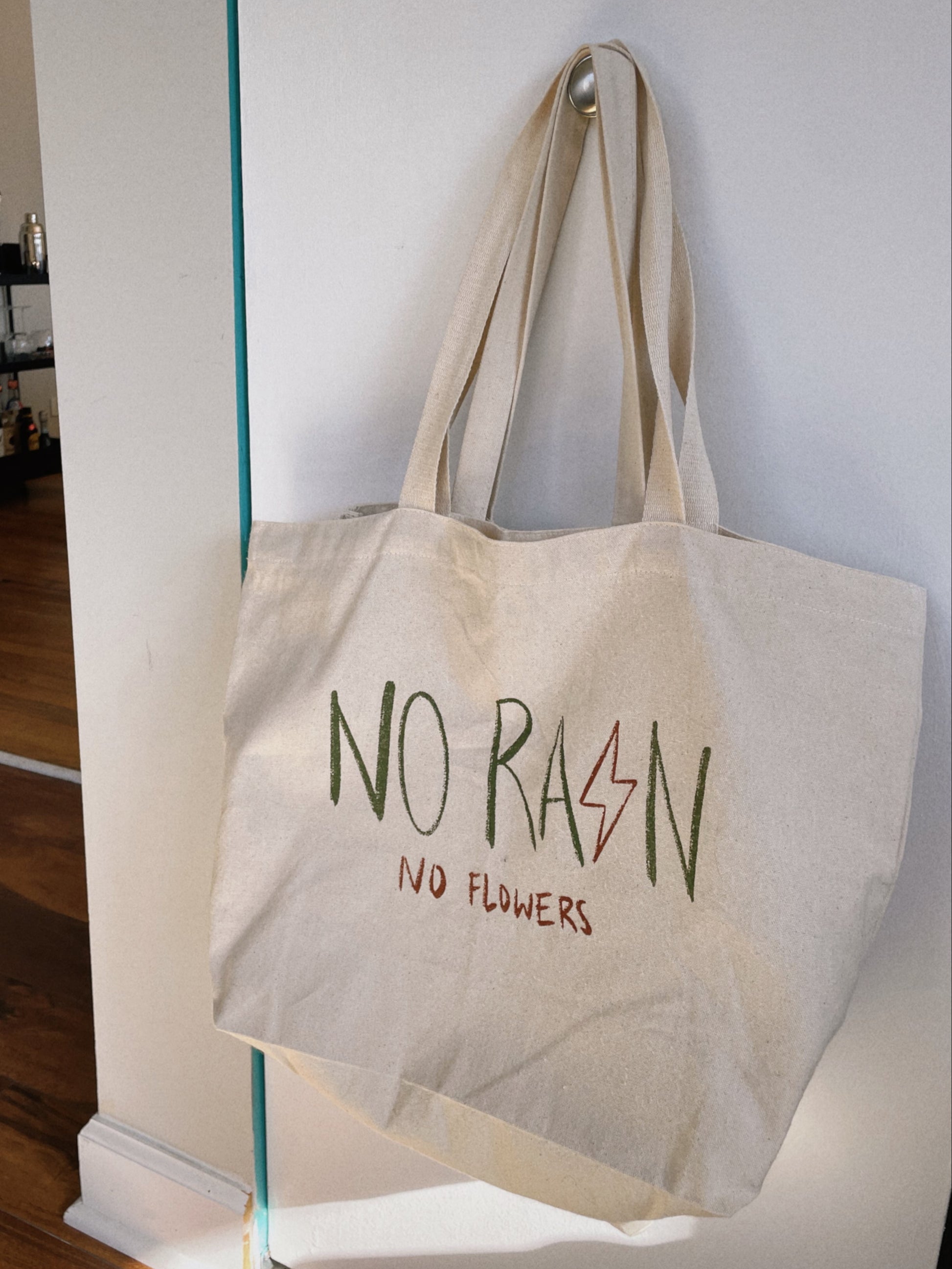 no rain, no flowers tote bag