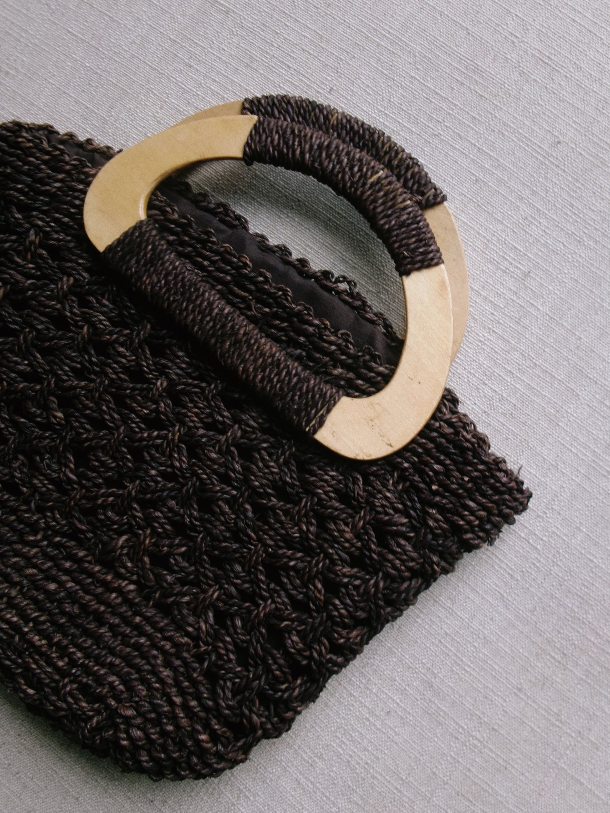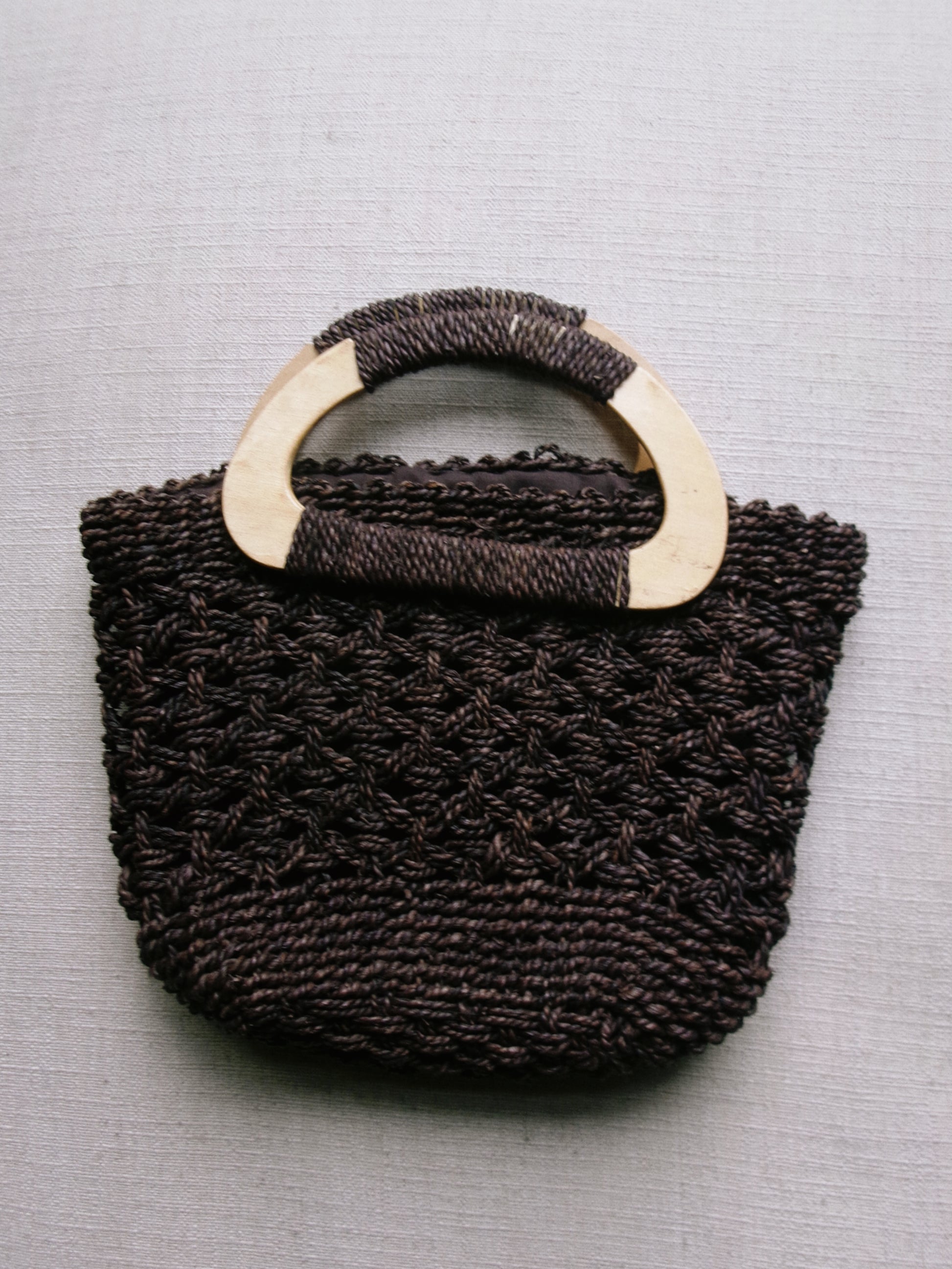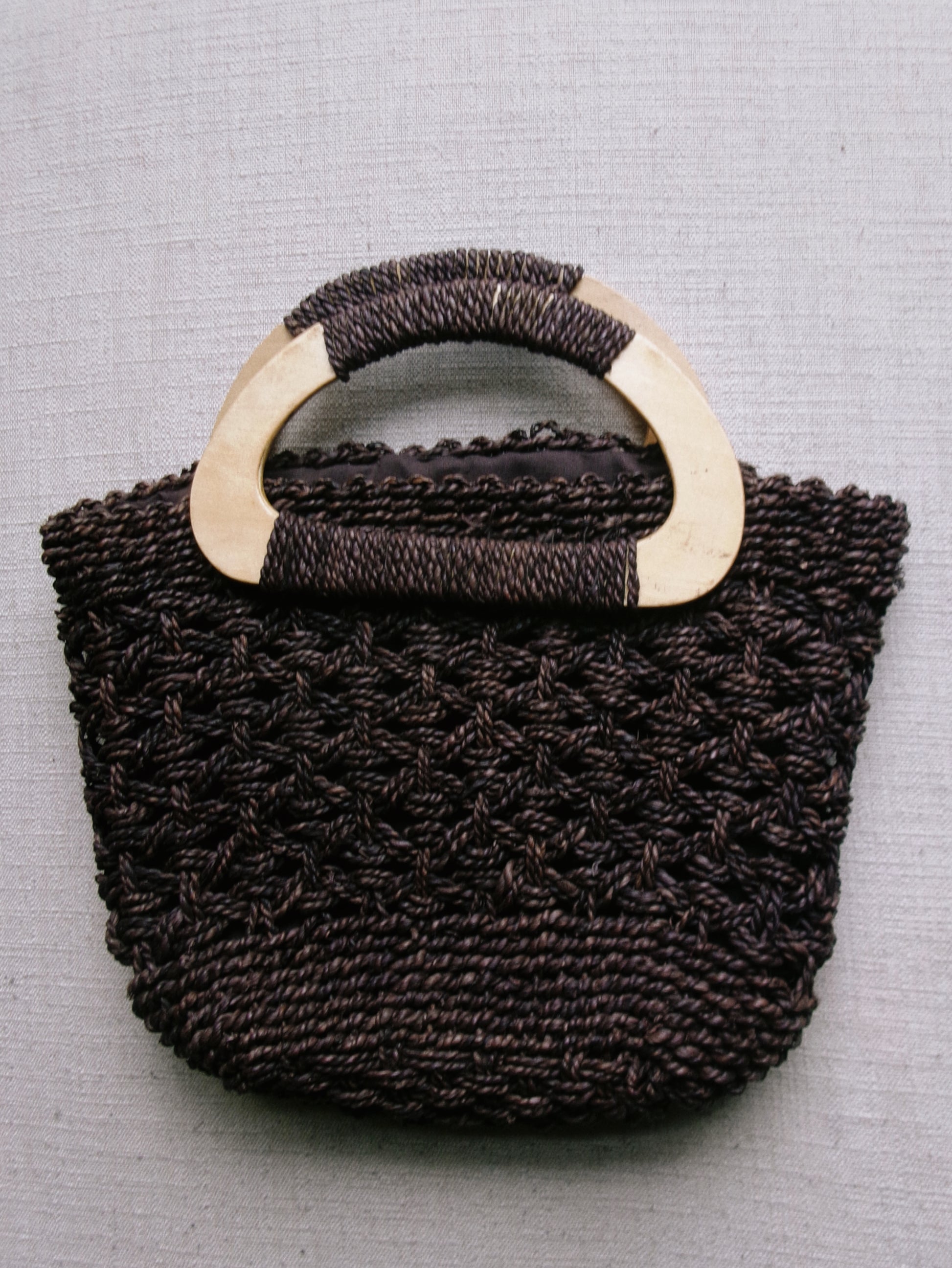 Dark brown basket bag with wood handles. The earthy, artisan-crafted feel makes it the perfect summer statement bag. Inside zipper pouch and side pocket.