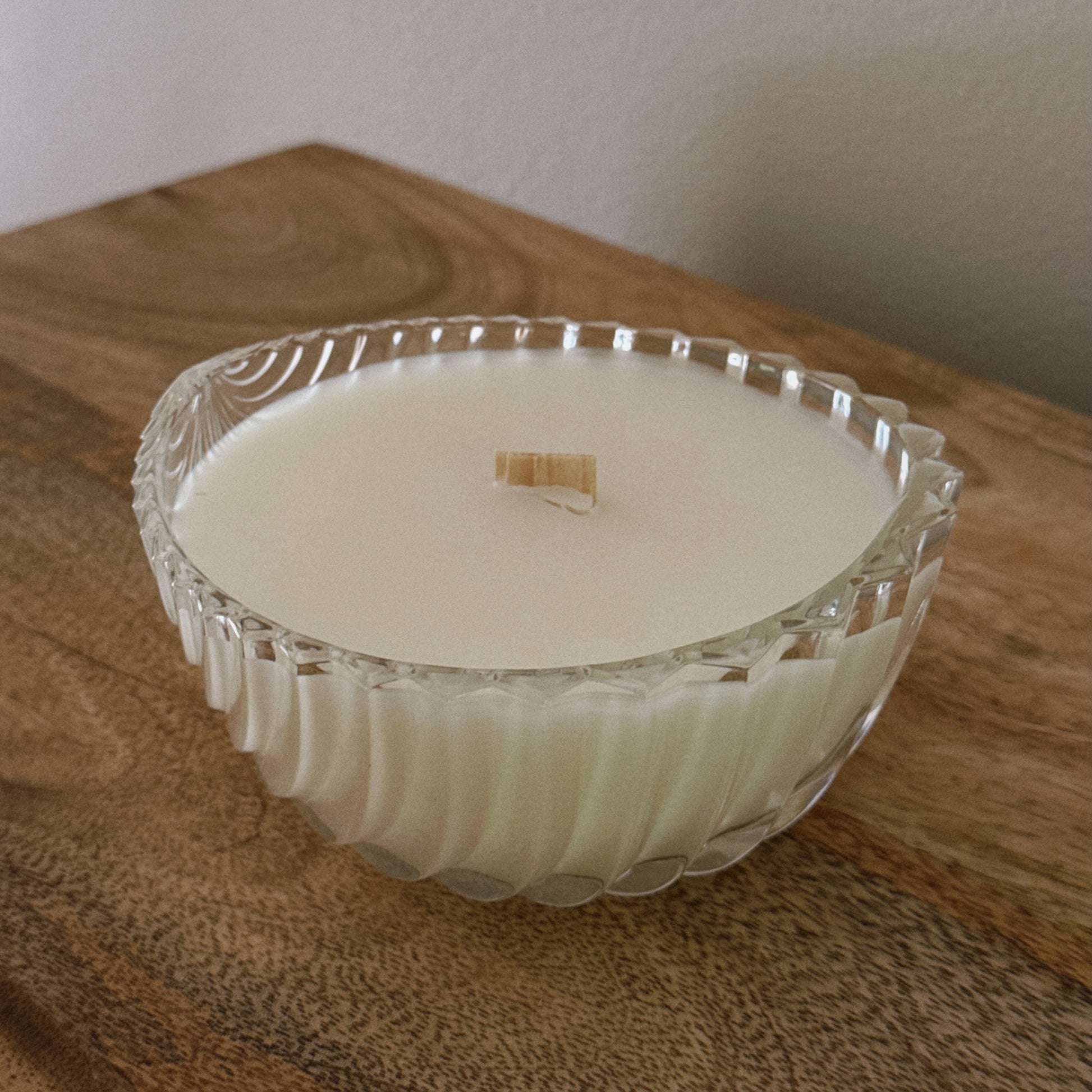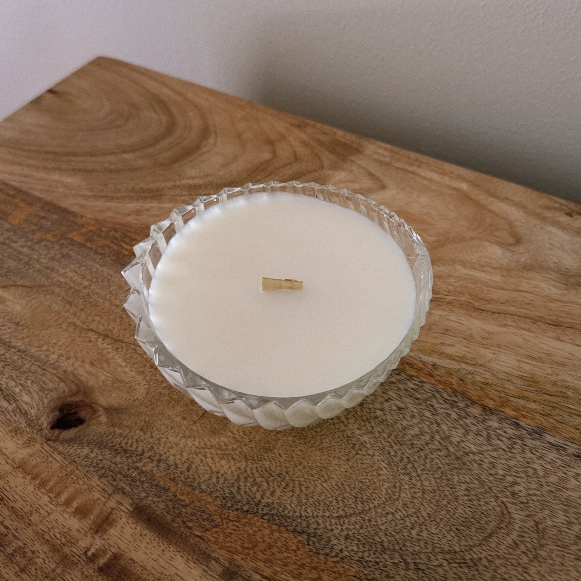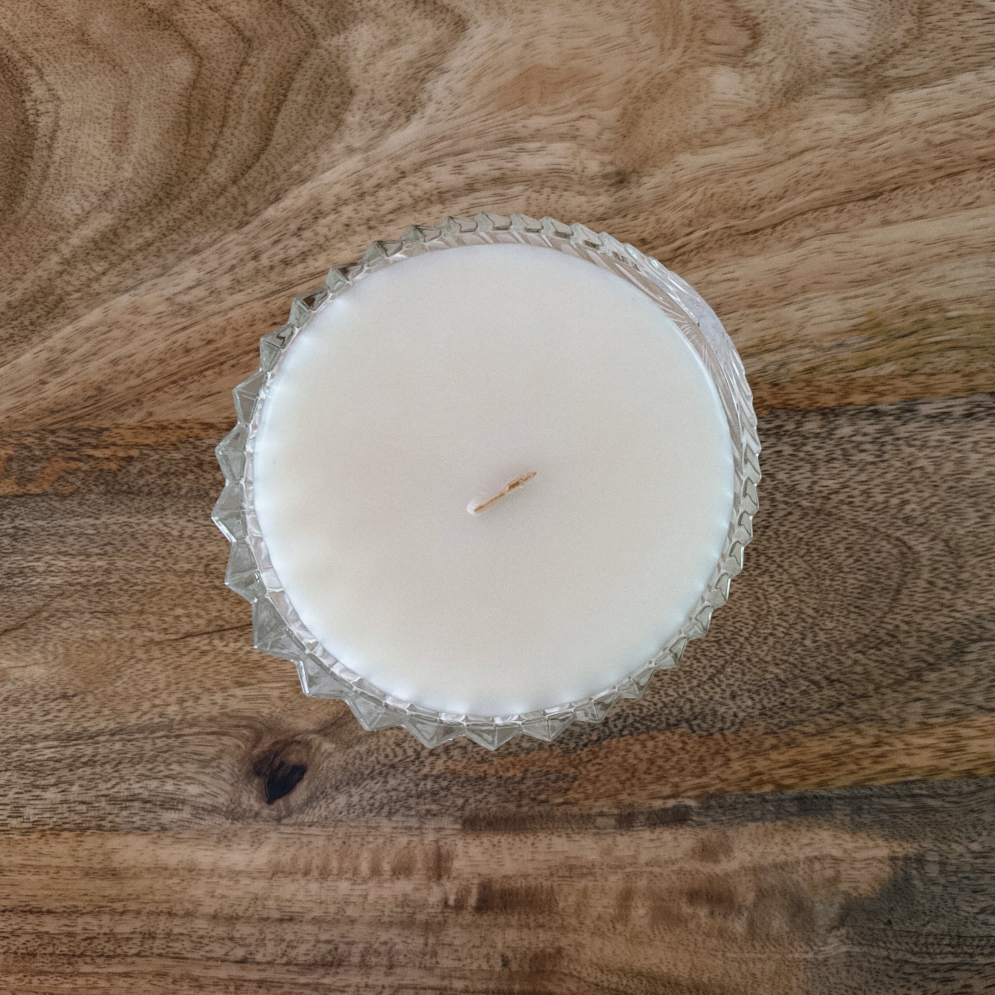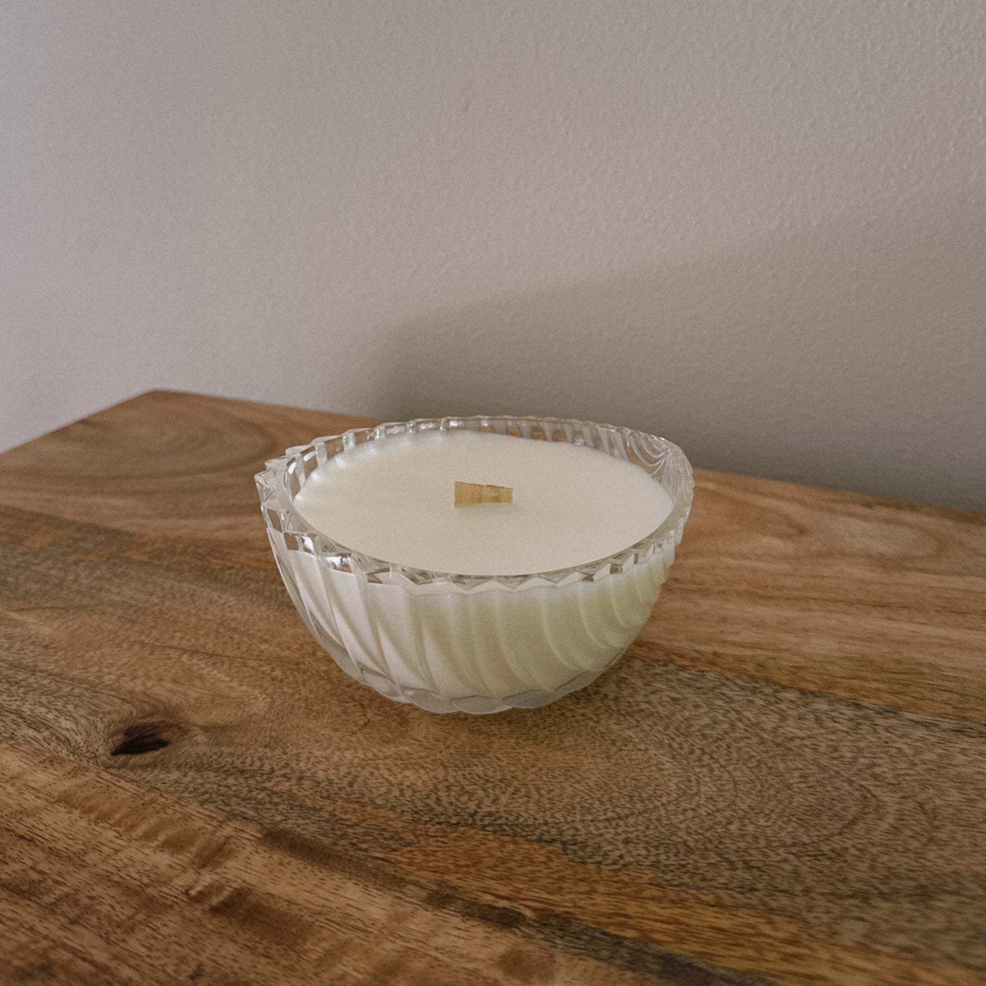 A warm, cozy glow meets timeless charm. This hand-poured soy wax candle is set in a vintage cut-glass bowl. Ideal for slow mornings or evening wind-downs.